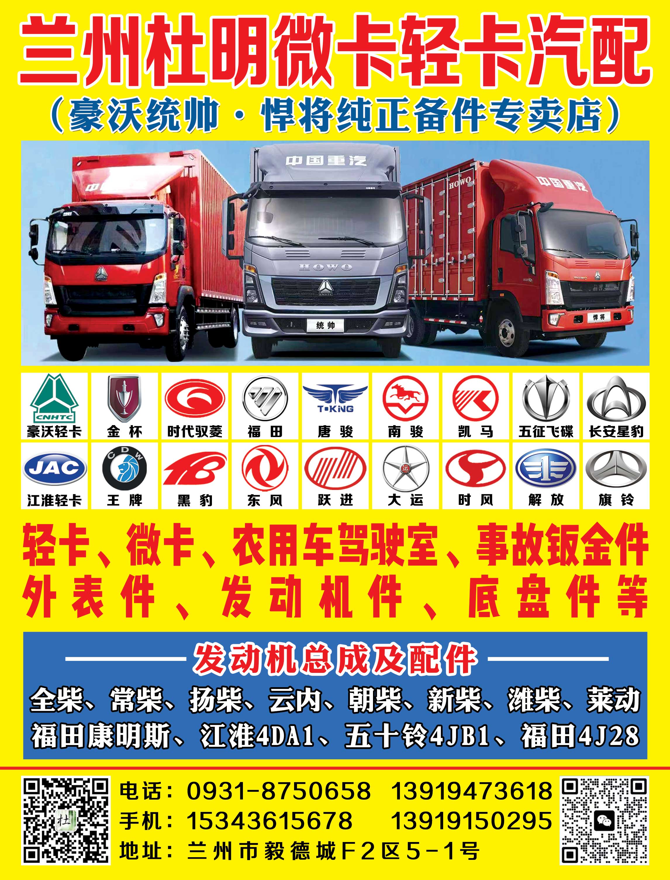豪沃轻卡,江淮,东风,跃进长安星豹、黑豹、金杯、福田、时代、江淮、东风、时风、凯马、五征、南骏、唐骏、王牌、豪沃轻卡、跃进、大运等众多微卡、轻卡发动机总成及零配件、底盘件、车身覆盖件、事故钣金件等。